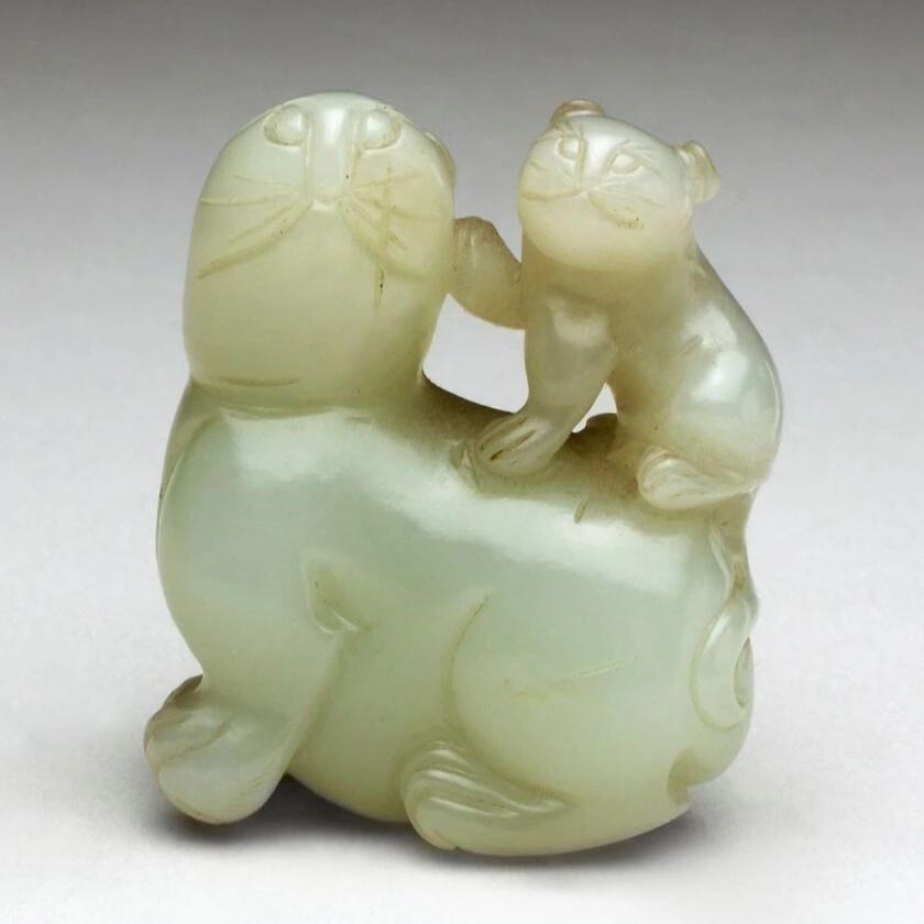 Olmec statuette depicting a figure holding a were-jaguar baby, jade, Mexico, 900 BCE-300 BCE